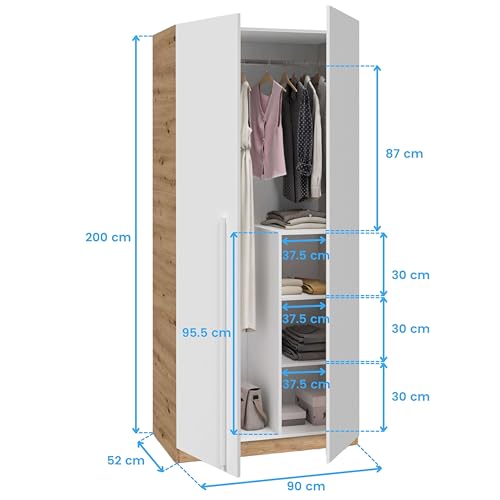 Habitdesign Armario Juvenil, Infantil, Ropero Individual, 200x90x52 (AltoxAnchoxFondo - en cm), Color Blanco Artik y Roble Nodi, Modelo Noa