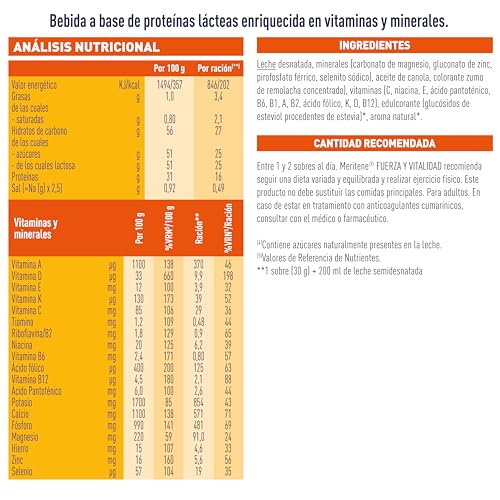 Meritene | Fuerza y Vitalidad | Batidos Sabor Fresa | Fuerza para tus Músculos, Vitalidad para ti | Solución Nutricional para Adultos con Proteínas, Vitaminas y Minerales| 15 Sobres | 450 gr