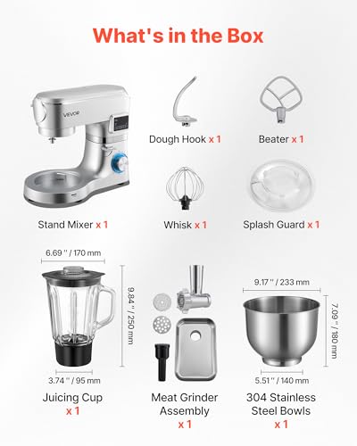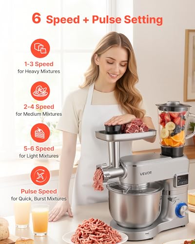 VEVOR Procesador de Alimentos Eléctrico Multifuncional de 1500 W, con Bol de Acero Inoxidable 5,7 L y Bol para Mezclar 1,5 L, 6 Velocidades + P, Gancho para Amasar, Batidor de Varillas y el Plano