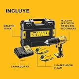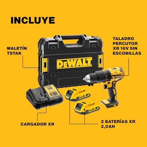 DEWALT XR 18V Brushless Taladro Atornillador Percutor Compacto a Batería, con 2 Baterías XR Li-Ion 2Ah, Cargador, Maletín, Alto Par, Luz LED, Rendimiento Versátil - DCD778D2T-QW