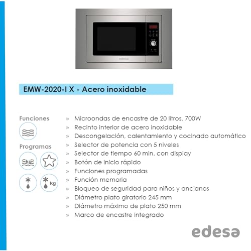 EDESA Microondas EMW 2020-I-X Marco Encastre Integrado, Capacidad de 20 litros, 5 Niveles de Potencia, Potencia 700W Acabado en Acero Inoxidable