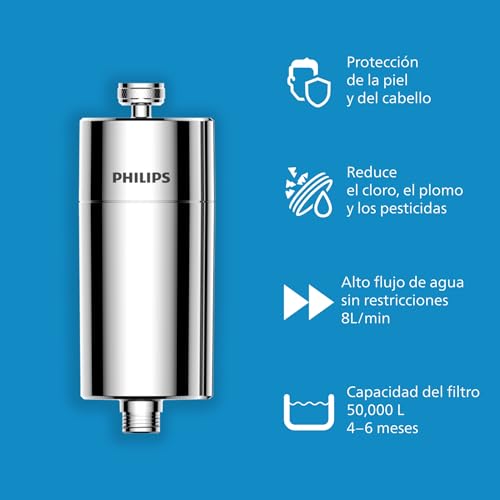 Philips Water filtro de ducha en línea – incluye 1 cartucho, filtración hasta 50.000 L, color cromado, reduce cloro hasta un 99%, fácil de instalar, compatible con la mayoría de duchas