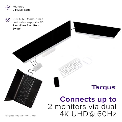 Targus Docking Station USB-C Dual HDMI 4K con Fuente de alimentación Pass-Thru de 100W, hub multipuerto Compatible con 2 monitores 4K UHD, estación Base – Gris, DOCK423EU