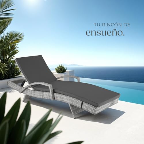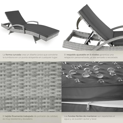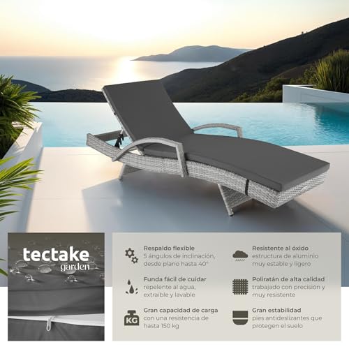 tectake® Tumbona Jardín Exterior de Ratán y Aluminio, Tumbona de Piscina con Respaldo Regulable en 5 Posiciones, Tumbona de Playa Impermeble y Resistente a Intemperie, Fácil Limpieza - Gris Claro